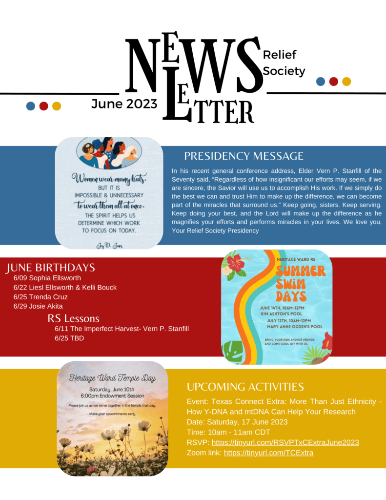 June 2023 RS Newsletter and Happenings Posted on June 5, 2023 Attached is the June newsletter along with a couple of other flyers about June happenings. Happy Summer to all!