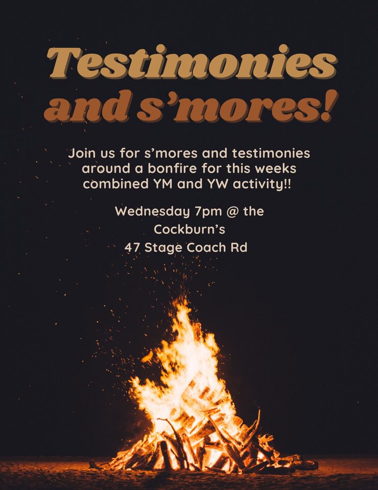 - YM/YW Combined Activity – Bonfire chat with the Bishop at 7:00 PM at the Cockburn’s home